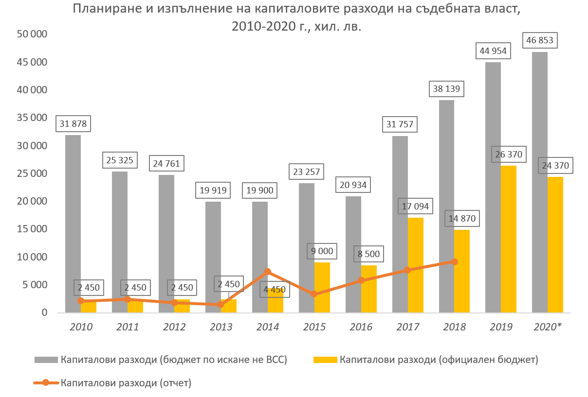 Ако разгледаме паралелно исканията на ВСС за капиталови разходи, одобрените им средства в бюджета за годината и отчета за същата година, се вижда сериозното разминаване между това, което се планира и това, което в крайна сметка се изпълнява. Обикновено, исканията на ВСС надвишават над два пъти одобрения бюджет, а отчетените средства, особено след 2015 г., са наполовина на одобрените. Самият размер на капиталовите разходи е нищожен на фона на общия бюджет на съдебната власт – много често под 1,5-2% от общите разходи. Зад тези факти могат да стоят различни обяснения: