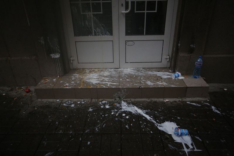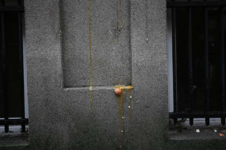Към 12 часа млада жена започна да хвърля яйца по сградата. Протестиращите я аплодираха, полицаите не реагираха. По-късно натам полетя и кофичка кисело мляко.