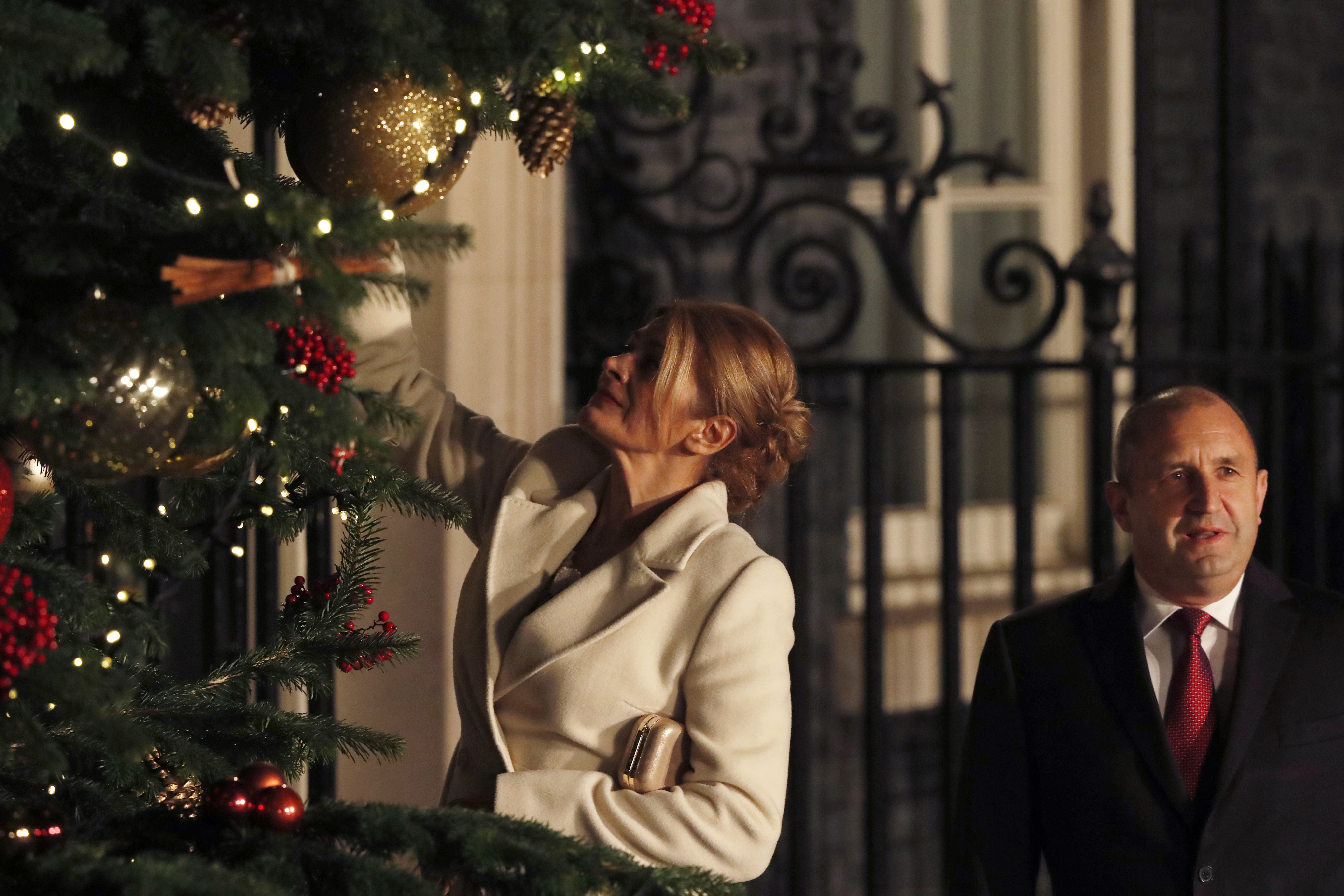 Тя придружава съпруга си на срещата на върха на НАТО в Лондон. Преди приема снощи в резиденцията на британския премиер Борис Джонсън Радева реши да доукраси елхата на "Даунинг стрийт" като окачи топка с шевица.