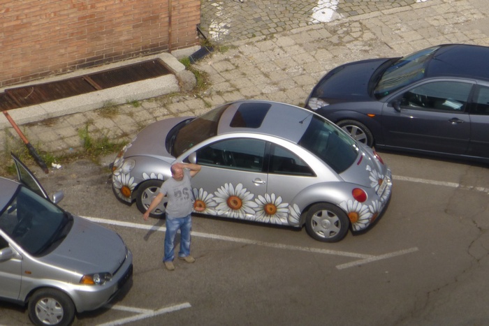 в матово оранжева боя и съответстващ цвят на кожената тапицерия. Или обратното.