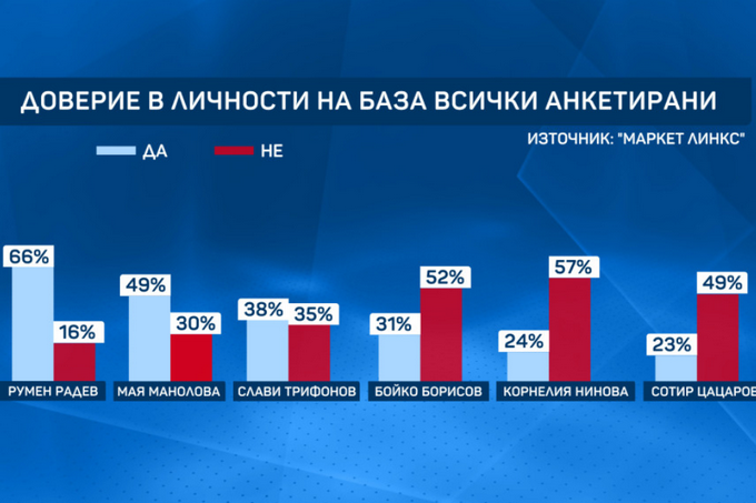 Най-одобряваните български политици и личности, свързани с политиката, са Румен Радев (66% доверие, 16% недоверие), Мая Манолова (49% доверие и 30% недоверие) и Слави Трифонов (38% одобрение и 35% недоверие). Премиерът Бойко Борисов е с 31% доверие и 52% недоверие.