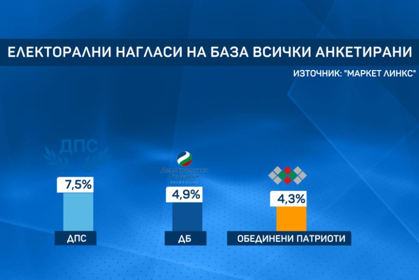 Следват ДПС (7,3%), „Демократична България” (4,9%), и „Обединени патриоти” (4,3%). „Воля” изглежда с малък шанс да бъде самостоятелна парламентарно представена партия след следващи избори (1,2%).