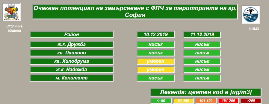 Станциите на ИАОС за София са разположени в кварталите "Надежда", "Хиподрума", "Младост", "Дружба" и "Павлово", както и на "Копитото". Данните за вчера (тези за днес ще бъдат публикувани утре) показват завишаване на ФПЧ10 навсякъде средно два пъти, с изключение на "Копитото" (което е резонно предвид факта, че местността се намира над града - във Витоша) и "Дружба".