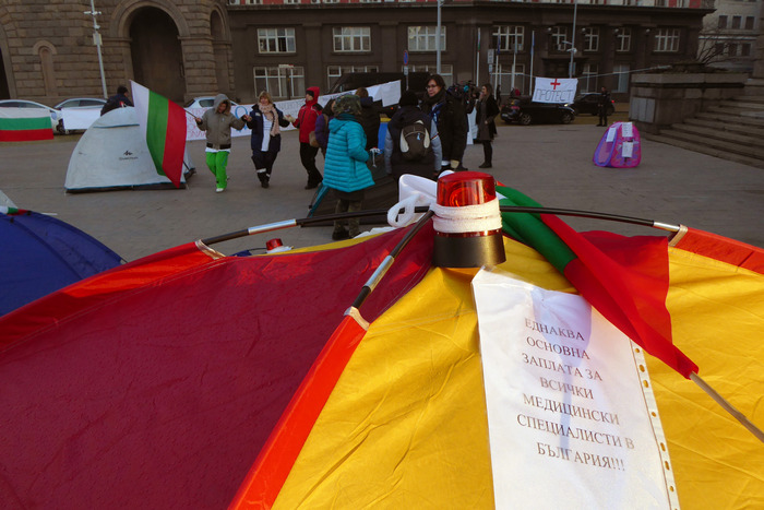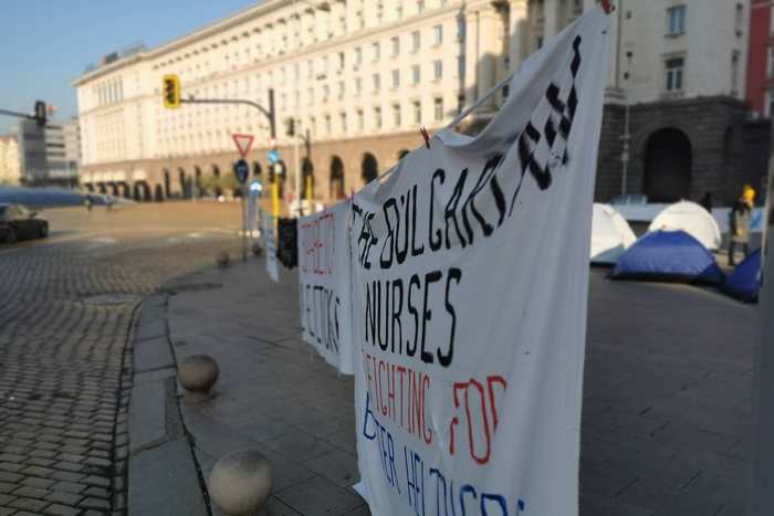 На палатков лагер в карето между сградите на Министерския съвет и бившия Партиен дом пренощуваха десетки медицински сестри в очакване премиерът Бойко Борисов да ги приеме за среща.