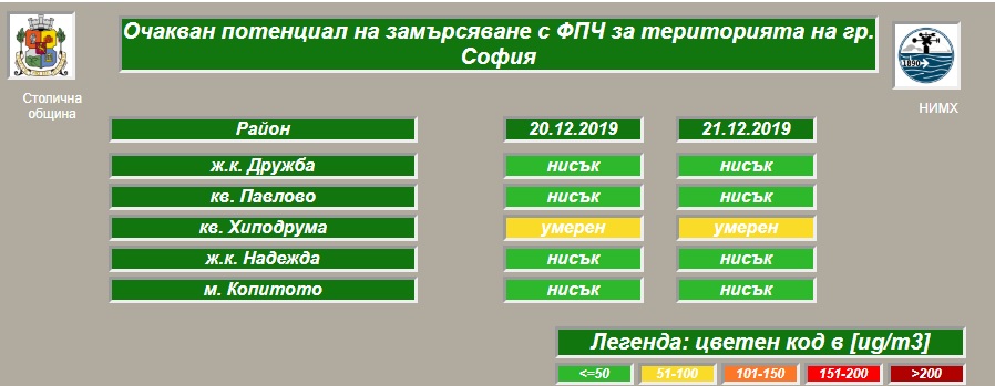 Осреднените данни за вчерашния ден показват завишаване в пъти на нормата при всички измервателни станции на екоминистерството (с изключение на Копитото на Витоша). В кв. "Дружба" ФПЧ е над 100 µg/m3, в "Надежда" и "Хиподрума" - над 200, в "Павлово" - над 150, а в "Младост" - близо 150.