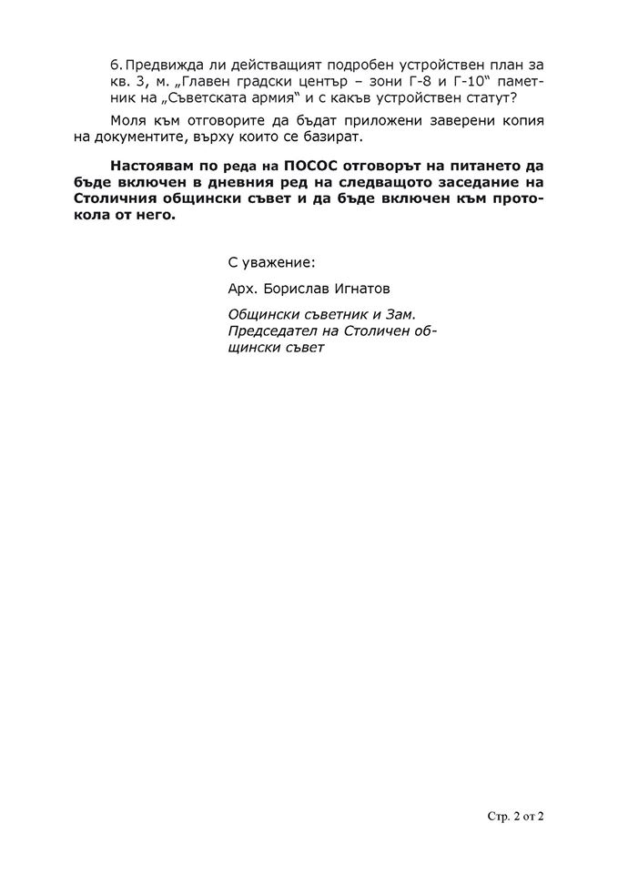 Общинският съветник от "Демократична България" Борислав Игнатов е отправил питане кмета на София чрез шефа на столичния общински съвет относно Паметника на Съветската армия. Въпросите, които Игнатов задава, са няколко, свързани основно със собствеността на земята.