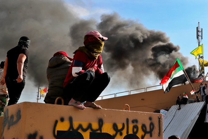 И таи вечер продължават сблъсъците около сградата на американското посолство в иракската столица Багдад. Охраната изстреля сълзотворни гранати, за да разпръсне протестиращите.