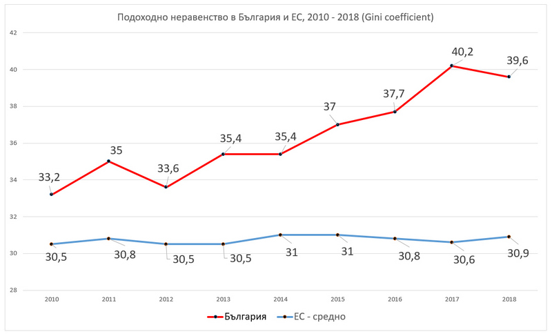 Между 2012 и 2016 г. разликата между доходите на най-богатите и най-бедните 20% от българите се увеличава от 6,2 до 7,9 пъти, с което страната ни става най-неравната в ЕС. Като причина за това са посочени “ниските разходи за социална закрила, които отчасти се дължат на ниското ниво на данъчни приходи и на липсата на прогресивност на данъчната система”, гласи буквално докладът на ЕК, която в други случаи, но не и в този, българското правителство обича да цитира.