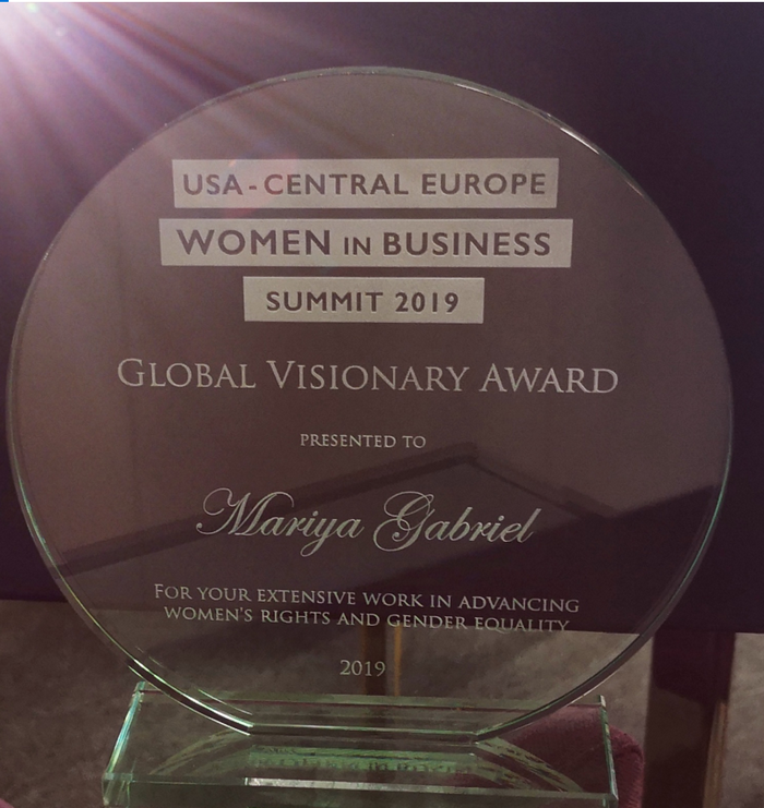 Българският еврокомисар Мария Габриел е удостоена с глобална визионерска награда за лидерството й в защитата на правата на жените и равенството между половете.