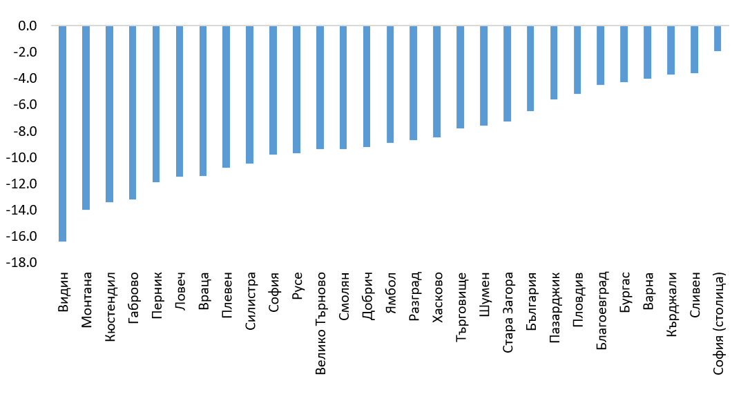 Едностранно негативен е естественият прираст в областите в България - в нито една от тях разликата между раждаемостта и смъртността не е положителна, въпреки това има големи разлики между тях (Графика 1)
