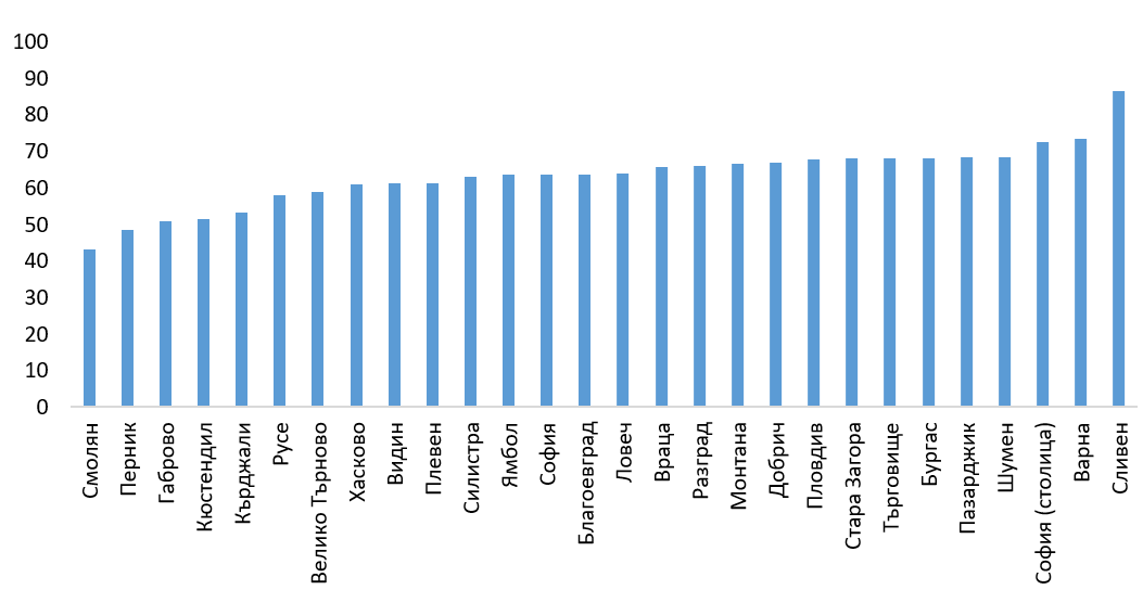 В нито една област младежите не са повече, а средно за страната през 2018 г. на всеки 100 бъдещи пенсионери се падат по 66 човека, които навлизат на пазара на труда (Графика 3). И тук обаче разликите са значителни – докато области като Сливен, Варна и столицата все още не срещат големи трудности във възстановяването на работната си сила, то за други като Смолян, Перник и Габрово застаряването ще се превръща във все по-голямо предизвикателство в бъдеще.