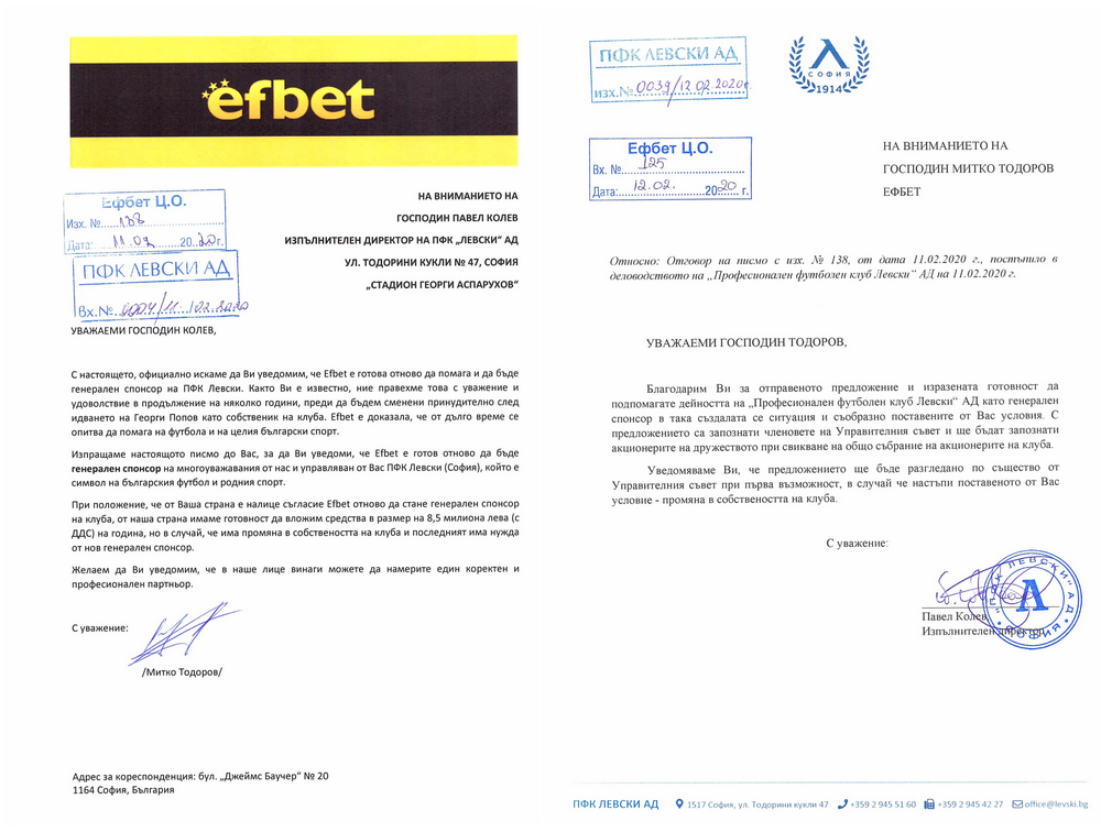 На 11.02.2020 г. в деловодството на „ПФК Левски“ беше получено писмо от хазартния оператор Efbet, с което се предлага финансова помощ с условие за прехвърляне на собствеността на отбора. В писмото не се посочва на кого следва да бъде прехвърлена собствеността, но е посочена сума под формата на спонсорство при евентуално изпълнение на условието.