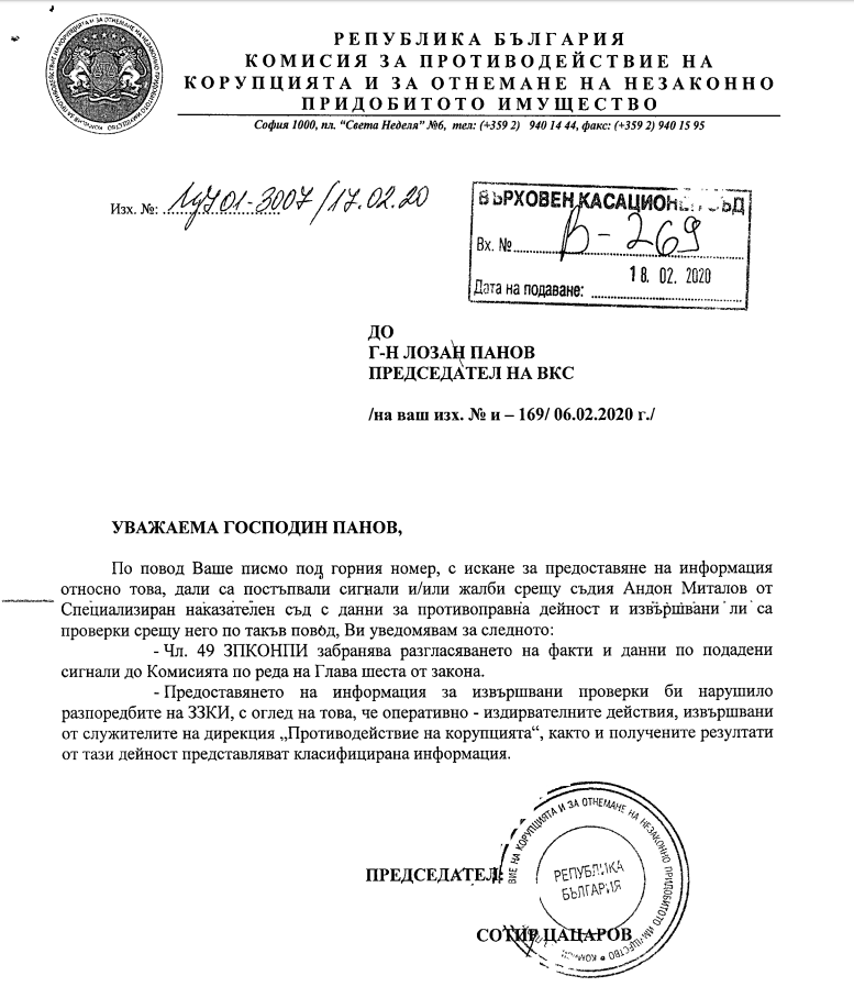 По-късно от ВКС разпространиха и писмото, подписано от председателя на КПКОНПИ Сотир Цацаров: