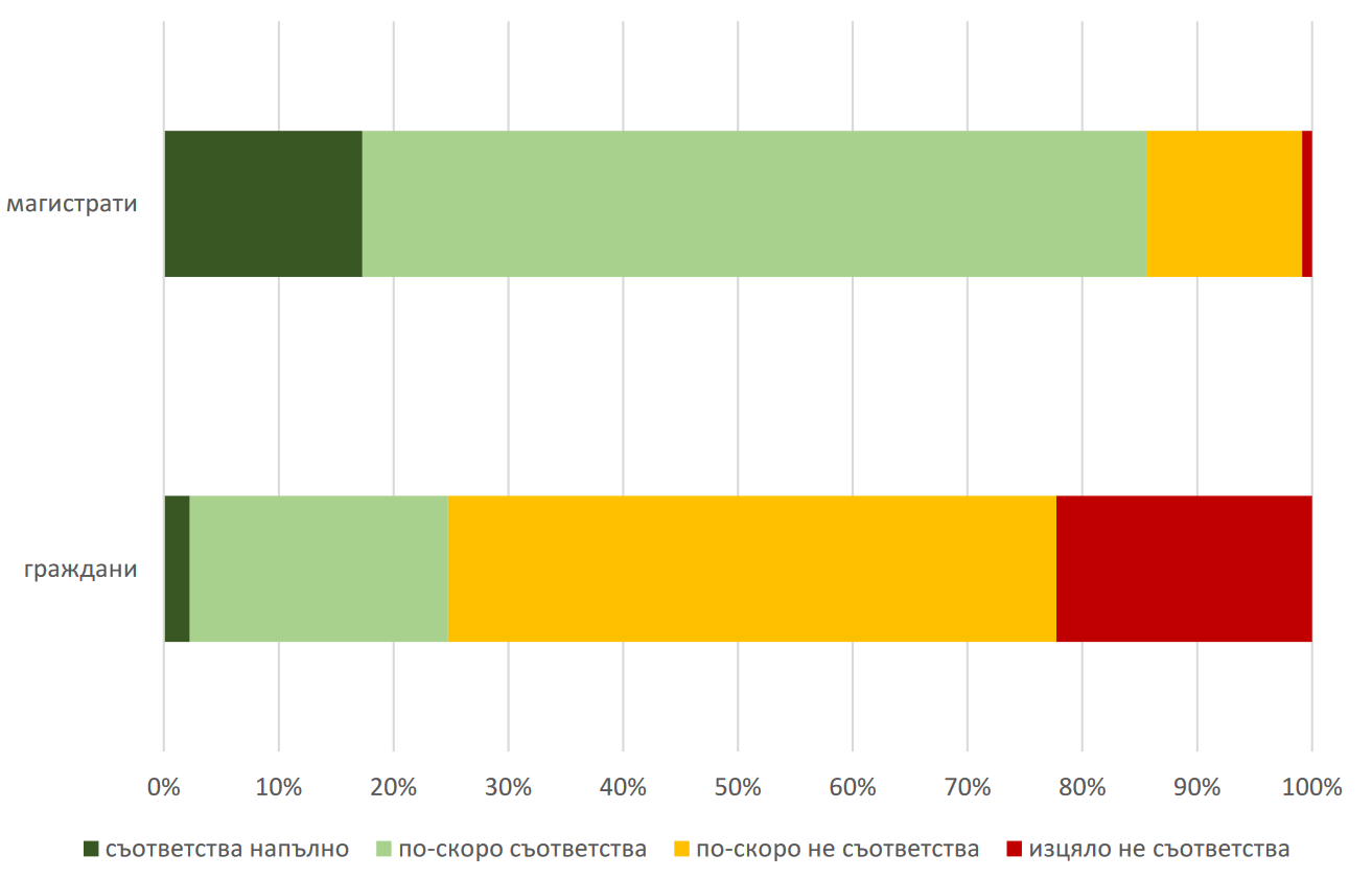 Подобно сериозно разминаване във възприятията има и във връзка с въпроса дали магистратите са обвързани само със закона: 85% магистратите отговарят положително в сравнение с едва 22% от гражданите, които смятат, че твърдението е вярно. Сходни са резултатите и по отношение на въпроса за достъпа до правосъдие, разпределението на делата и др.