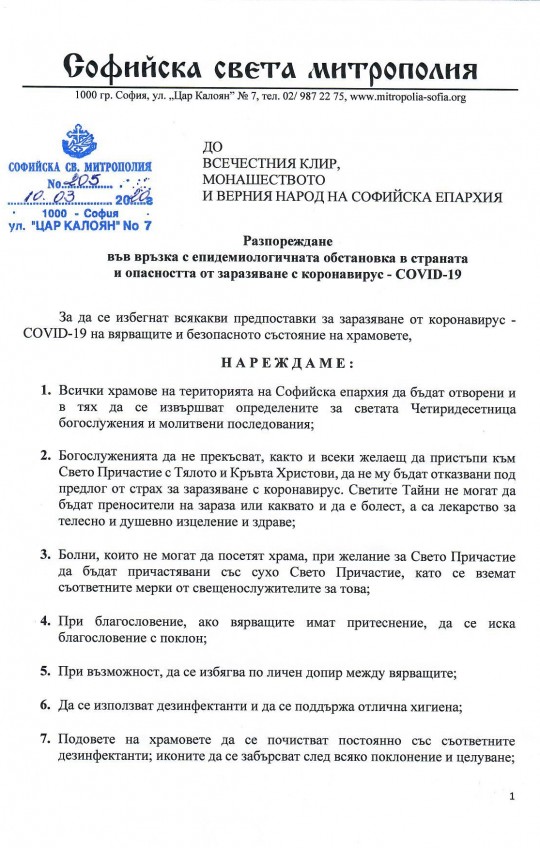 Междувременно патриарх Неофит, който е и Софийски митрополит, изпрати писмо с подробни указания за поведението на църквата, свещениците и вярващите в условия на епидемия от коронавирус. В писмото се потвърждава, че храмовете остават отворени, а свещениците не бива да отказват причастие, защото „светите тайнства не могат да бъдат преносители на зараза и каквато и да е болест, а са лекарство за телесно и душевно изцеление и здраве“.