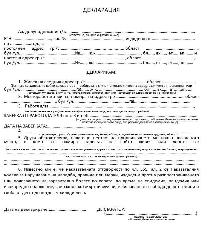 Ако ви е необходима декларация, за влизане или излизане от областен град, ТУК МОЖЕТЕ ДА Я ИЗТЕГЛИТЕ.