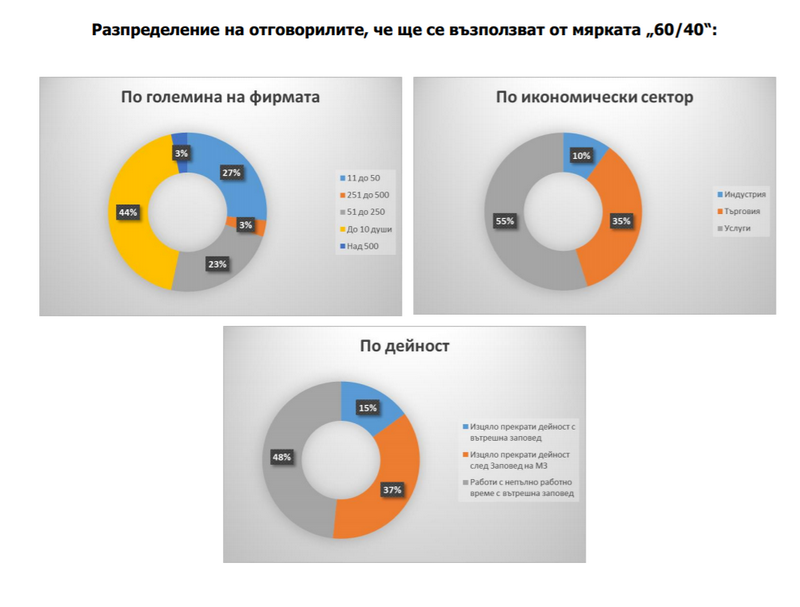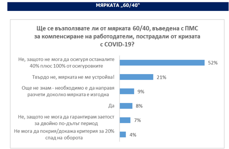 Работодателите, които няма да се възползват от мярката 60/40, планират други мерки по отношение на персонала, като най-голям процент от тях (42 на сто) планират частични съкращения.