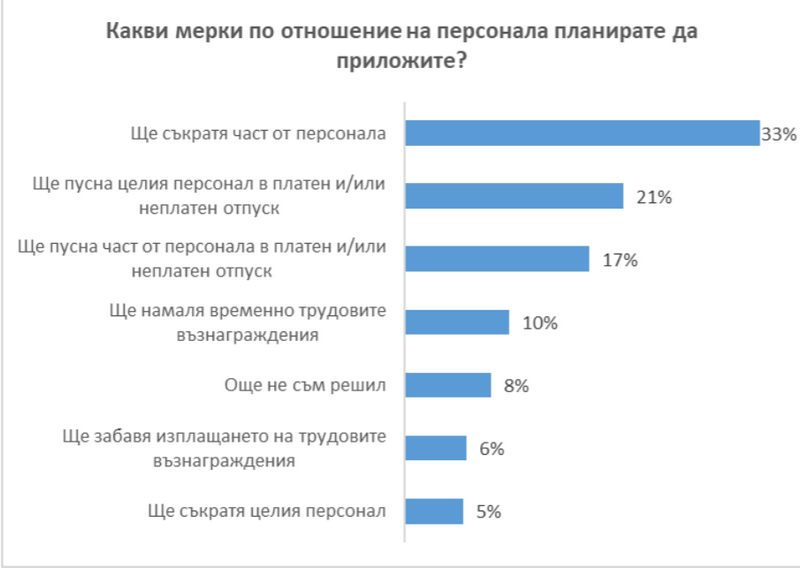 Приравнени към 100 процента, данните показват следното: ще съкратя част от персонала - 33 на сто, ще пусна целия персонал в отпуск - 21 на сто, ще пусна част от персонала в отпуск - 17 на сто, ще намаля временно трудовите възнаграждения - 10 на сто, още не са решили - 8 на сто, ще забавя изплащането на възнаграждения - 6 на сто, ще съкратя целия персонал - 5 на сто.