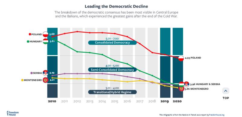 Полша обаче отпада от групата на консолидираните демокрации и се превръща в полуконсолидирана демокрация, докато Унгария , Сърбия и Черна гора са напуснали изцяло категорията на демокрациите и са станали преходни/хибридни режими. В доклада се посочва, че членката на ЕС Унгария има най-големия срив за 25-те години, откакто „Фрийдъм хаус“ публикува доклада си „Нации в преход“.
