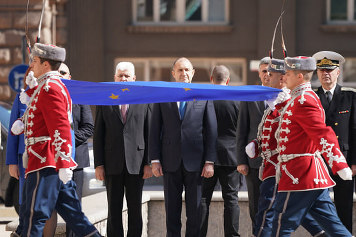 Президентът Румен Радев и вицепрезидентката Илиана Йотова поднесоха цветя пред Паметника на незнайния воин, а след това участваха в церемония по издигане на знамето на Европейския съюз пред президентството.