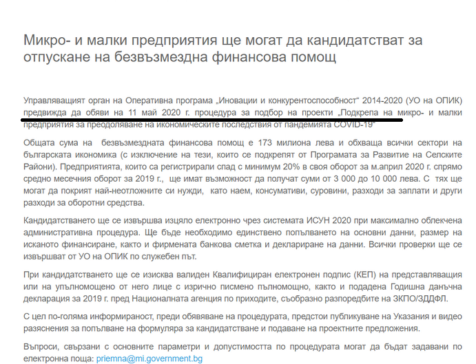 Какво се оказа? Въпреки че датата за стартирането на програмата е обявена за днес - такава в системата на ИСУН все още на практика няма. Още в самото начало стана ясно, че финансирането по схемата идва от оперативна програма "Иновации и конкуретоспособност". И в момента на електронната страница на Програмата може да се види, че последното информативно съобщение гласи, че "УО на оперативна програма "Иновации и конкурентоспособност" предвижда да обяви на 11 май 2020 година процедура за подбор на проекти "Подкрепа на микро- и малки предприятия за преодоляване на икономическите последствия от пандемията COVID-19".