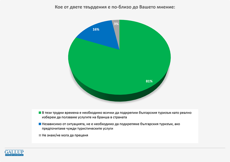 Според "Галъп" се регистрира и вълна на своеобразен „туристически патриотизъм“. 81% от анкетираните смятат, че е необходимо родният туризъм да се подкрепи – чрез избор на такава дестинация за почивка пред алтернативи в чужбина.