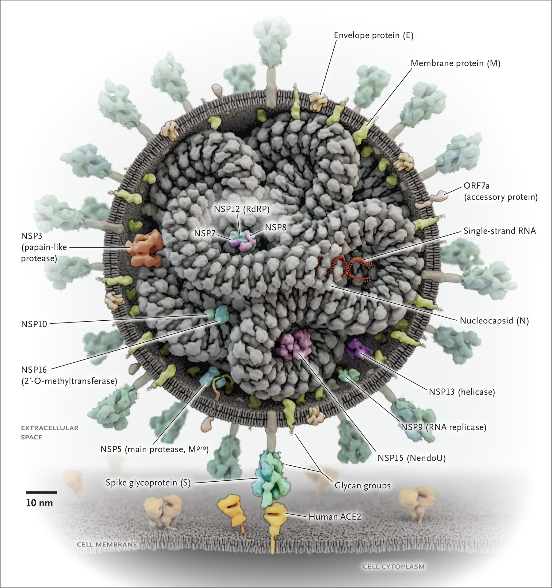 Приблизително 25 протеина са необходими на вируса да зарази човек и да започне да се размножава (репликация). Сред тях са: прословутият протеин, който прилича на шипче и атакува човешкия ангиотензин-конвертиращ ензим в началния етап на инфекцията; две протеази, които разцепват вирусни и човешки протеини; РНК полимеразата, която синтезира вирусна РНK и РНК-разцепващата ендорибонуклеаза.