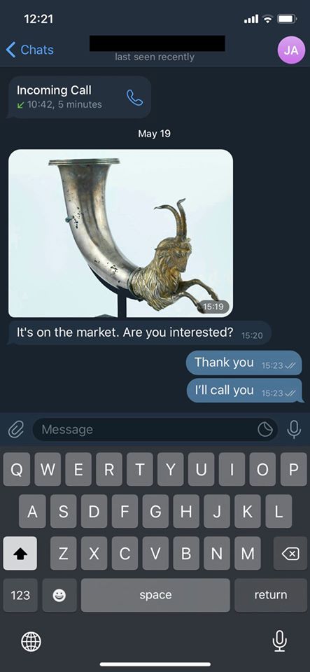 "Миналата седмица се появи на свободния пазар", посочва още Божков и показва снимка. Той прилага съобщение от 19 май, в което му издават, че ритонът е за продан. Но не става ясно кой е продавачът.