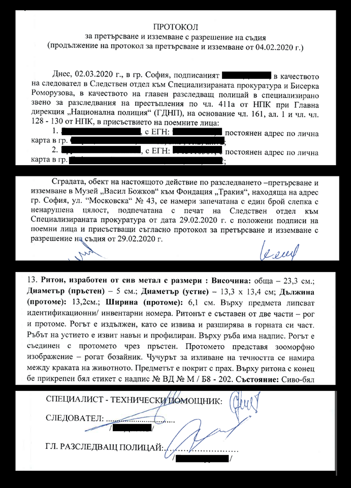Иззет е на 4 февруари тази година, за което има издаден протокол, носещ подписите на главен разследващ полицай, следовател и специалист - технически помощник. Приложено е и описание на иззетия артефакт. То отговаря на снимките на ритона, публикувани от Васил Божков, но само специалисти могат да твърдят това със сигурност.