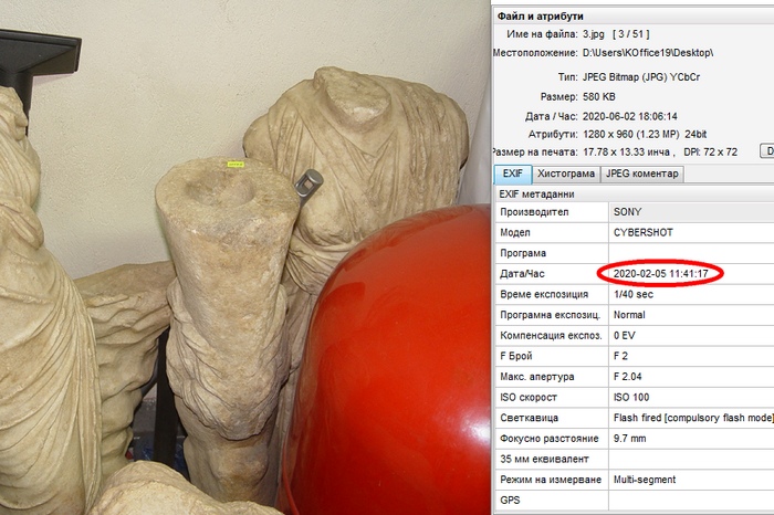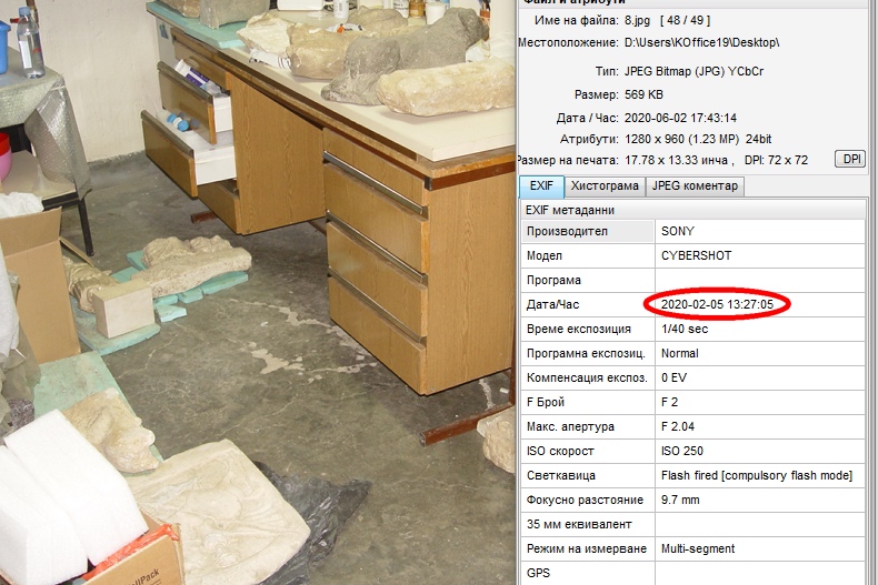 Но в тях се крие и истинската дата на заснемане на кадрите - а не тази на запазването на файла. И тя сочи, че всички снимки, публикувани днес, са заснети на 05.02.2020 г., между 11 и 13 ч. Или два дни, след като реставратори, експерти и поемни лица влязоха в сградата на "Нове холдинг", за да описват предметите в колекцията.