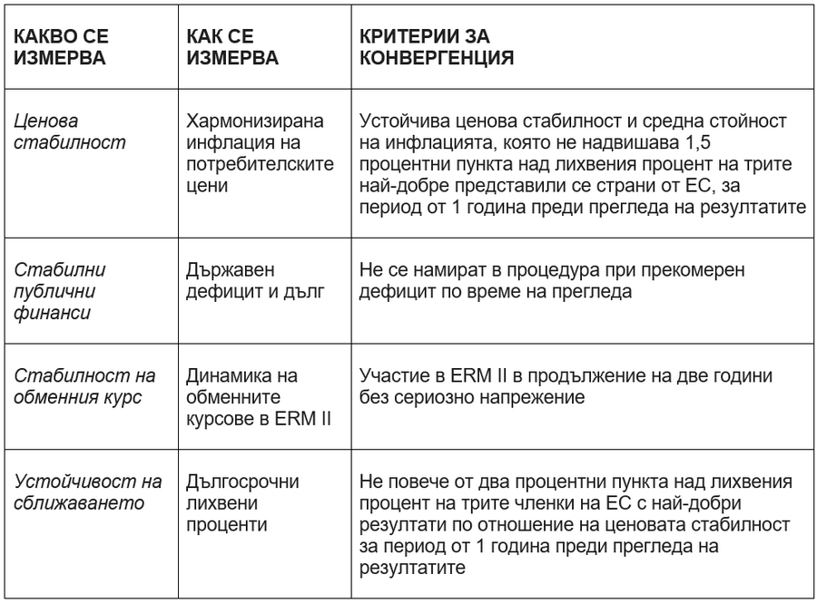 В разширения доклад на ЕЦБ разбираме следното - България не отговаря на критерия за инфлация, като родната надхвърля 2,6%, при референтна от 1,8%. Все пак банката предполага намаляване на този процент през следващите години, но до момента България никога не е прехвърляла това правило и това се случва за първи път.