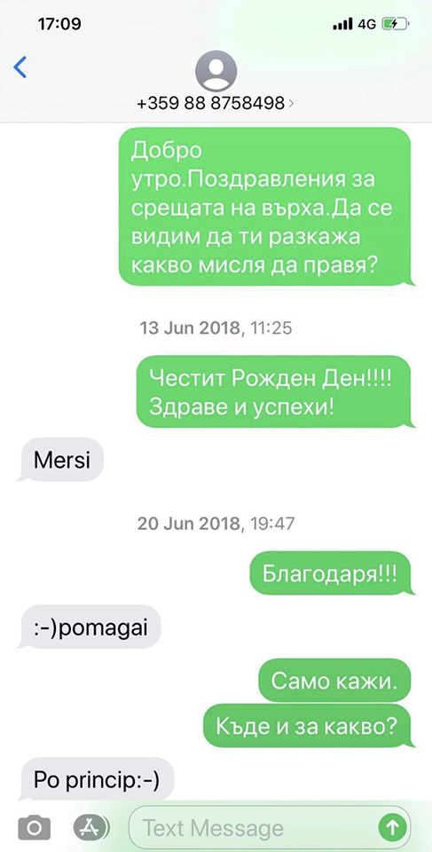 На пусната на профила му картинка първо се вижда как Божков поздравява Борисов с неизяснена дата и му иска среща. Отговор няма. После се вижда диалог от 13 юни 2018 г., при който той му честити рождения ден. Премиерът каза преди няколко дни, че въобще няма кирилица на телефона си, и публикуваното потвърждава това - отговорите наистина са на латиница: